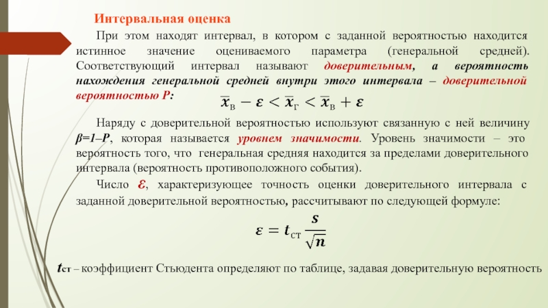 Число ε, характеризующее точность оценки доверительного интервала с заданной доверительной вероятностью, рассчитывают по следующей формуле: