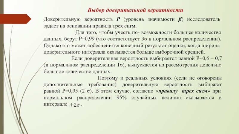 Наряду с доверительной вероятностью используют связанную с ней величину β=1–Р, которая называется уровнем значимости. Уровень значимости – это вероятность того, что генеральная средняя находится за пределами доверительного интервала (вероятность противоположного события).