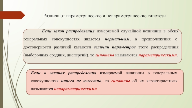 Если о законах распределения измеряемой величины в генеральных совокупностях ничего не известно, то гипотезы об их характеристиках называются непараметрическими