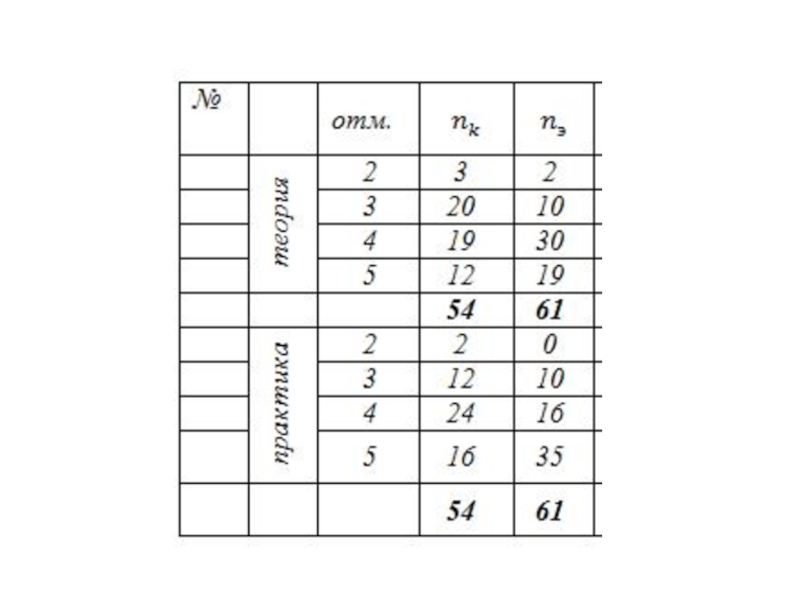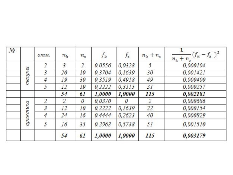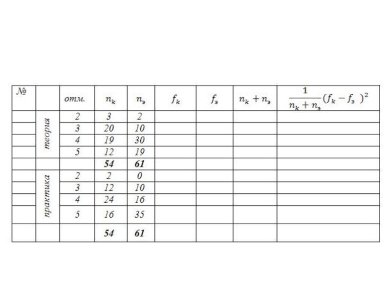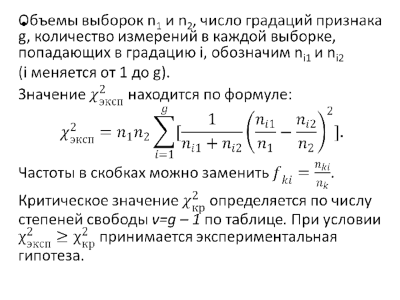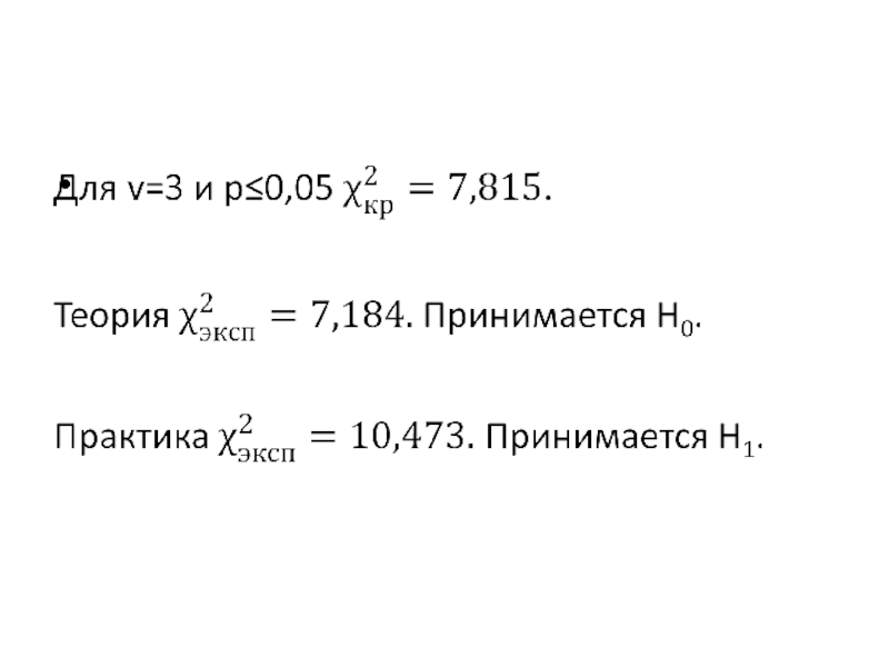 Далее по сопоставлению частот определяется экспериментальное значение критерия, которое сравнивается с критическим и на основании этого осуществляется выбор гипотезы.