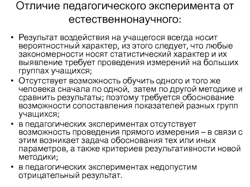 Слайд 4Отличие педагогического эксперимента от естественнонаучного: