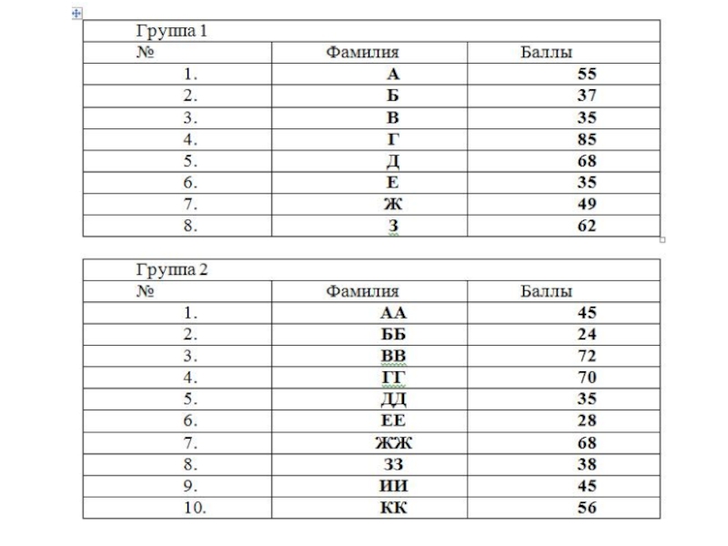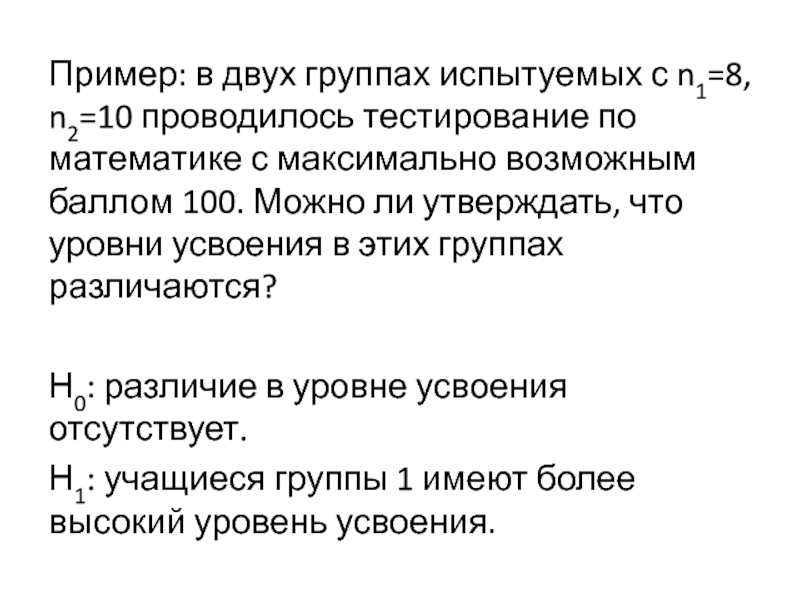 Слайд 28Пример: в двух группах испытуемых с n1=8, n2=10 проводилось тестирование