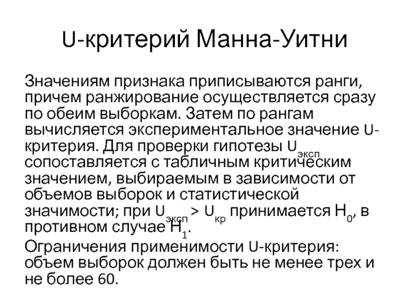 Ограничения применимости U-критерия: объем выборок должен быть не менее трех и не более 60.
