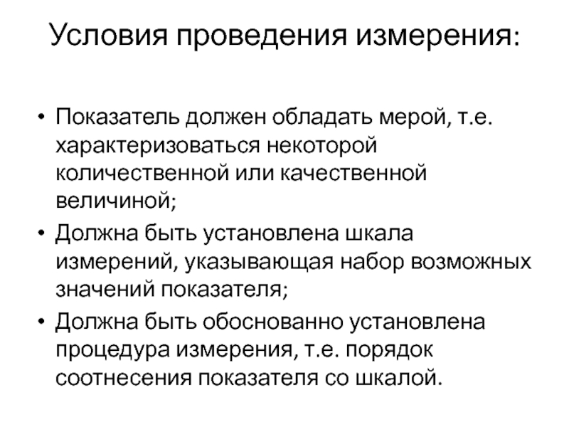 Должна быть обоснованно установлена процедура измерения, т.е. порядок соотнесения показателя со шкалой.