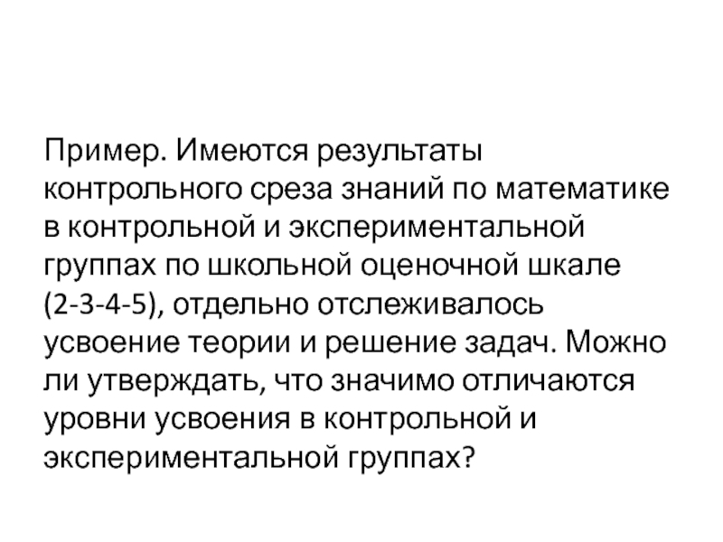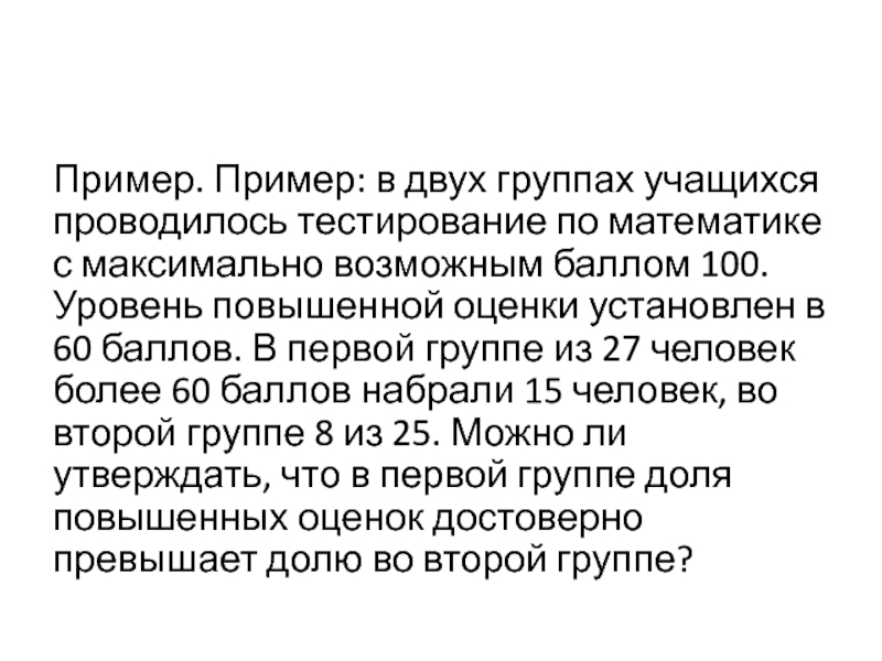 Слайд 50Пример. Пример: в двух группах учащихся проводилось тестирование по математике