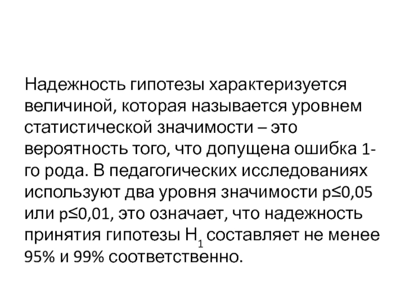 Слайд 24Надежность гипотезы характеризуется величиной, которая называется уровнем статистической значимости –