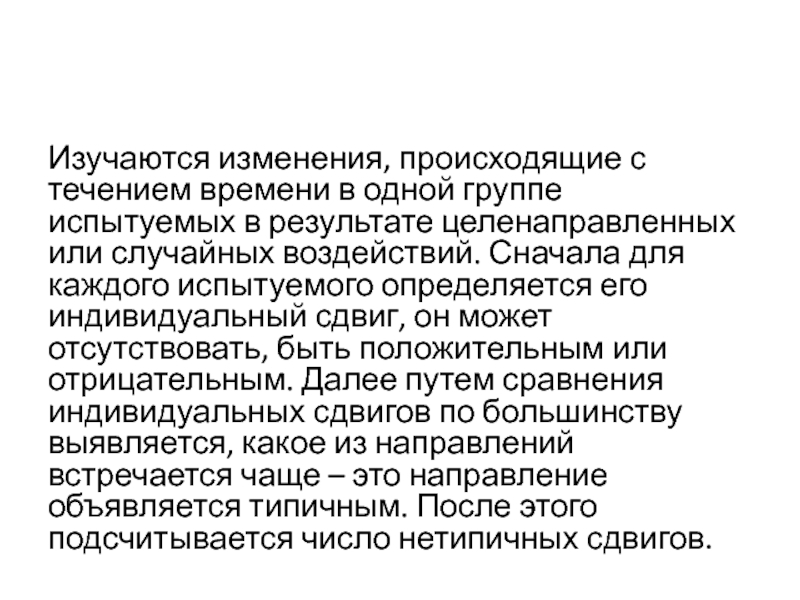 Слайд 33Изучаются изменения, происходящие с течением времени в одной группе испытуемых