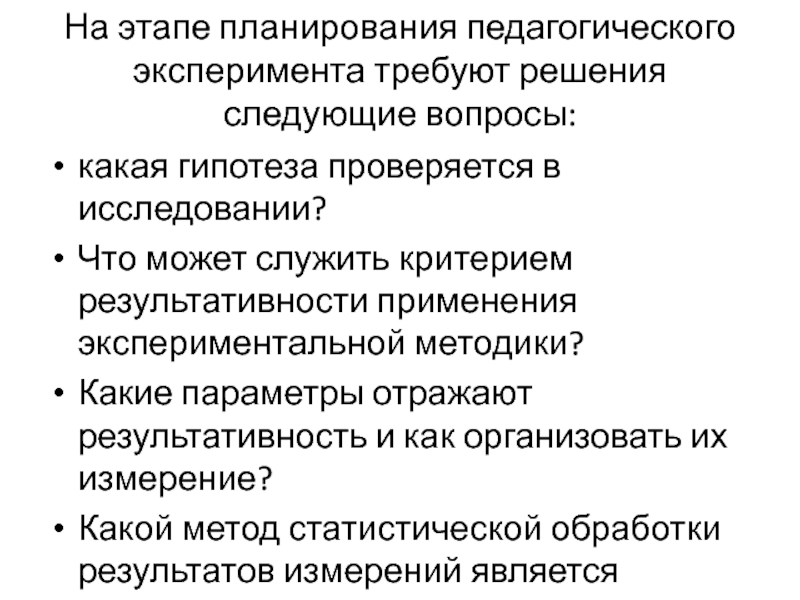 На этапе планирования педагогического эксперимента требуют решения следующие вопросы: