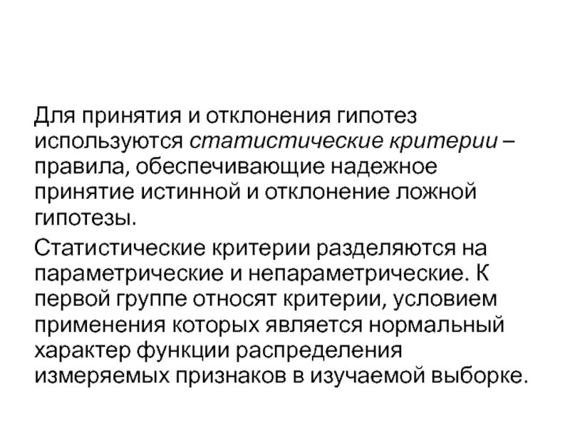 Слайд 25Для принятия и отклонения гипотез используются статистические критерии – правила,