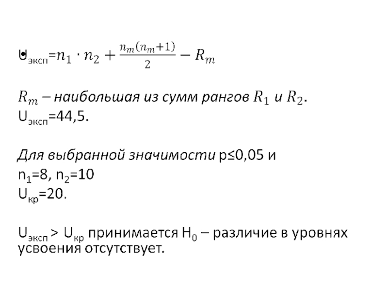 обеим выборкам. Затем по рангам вычисляется экспериментальное значение U-критерия. Для