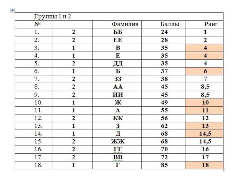 Значениям признака приписываются ранги, причем ранжирование осуществляется сразу по