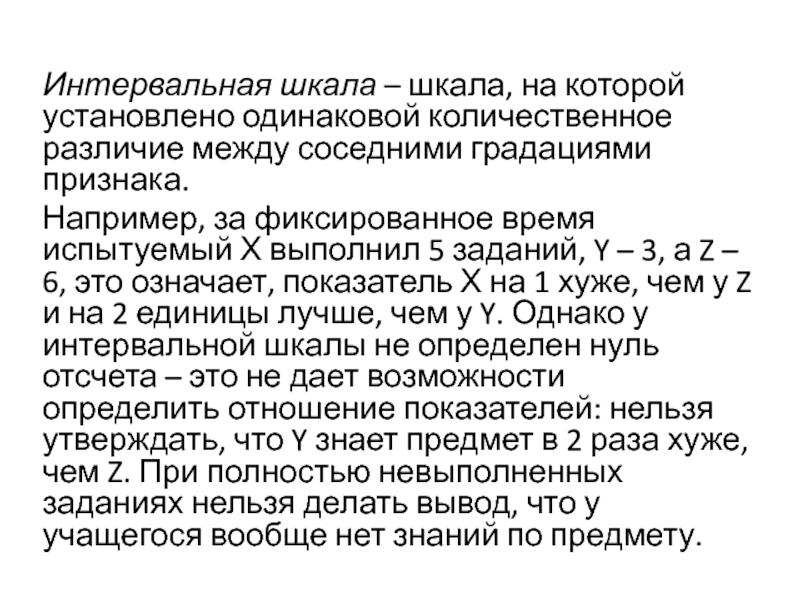 5 заданий, Y – 3, а Z – 6, это означает, показатель Х на 1 хуже, чем у Z и на 2 единицы лучше, чем у Y. Однако у интервальной шкалы не определен нуль отсчета – это не дает возможности определить отношение показателей: нельзя утверждать, что Y знает предмет в 2 раза хуже, чем Z. При полностью невыполненных заданиях нельзя делать вывод, что у учащегося вообще нет знаний по предмету.
