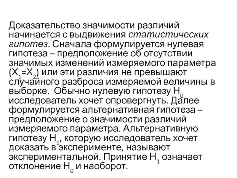 Слайд 21Доказательство значимости различий начинается с выдвижения статистических гипотез. Сначала формулируется