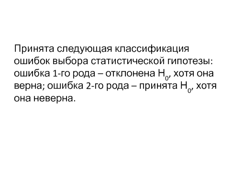Слайд 23Принята следующая классификация ошибок выбора статистической гипотезы: ошибка 1-го рода