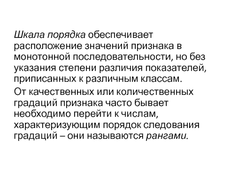 Слайд 10Шкала порядка обеспечивает расположение значений признака в монотонной последовательности, но