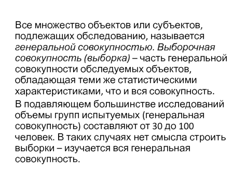 Слайд 8Все множество объектов или субъектов, подлежащих обследованию, называется генеральной совокупностью.