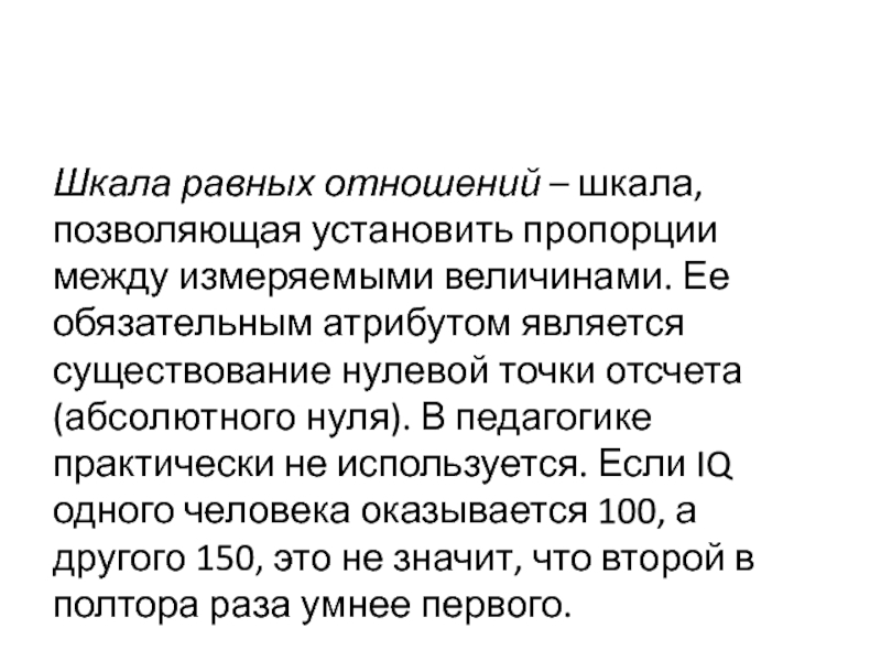 нуля). В педагогике практически не используется. Если IQ одного человека оказывается 100, а другого 150, это не значит, что второй в полтора раза умнее первого.