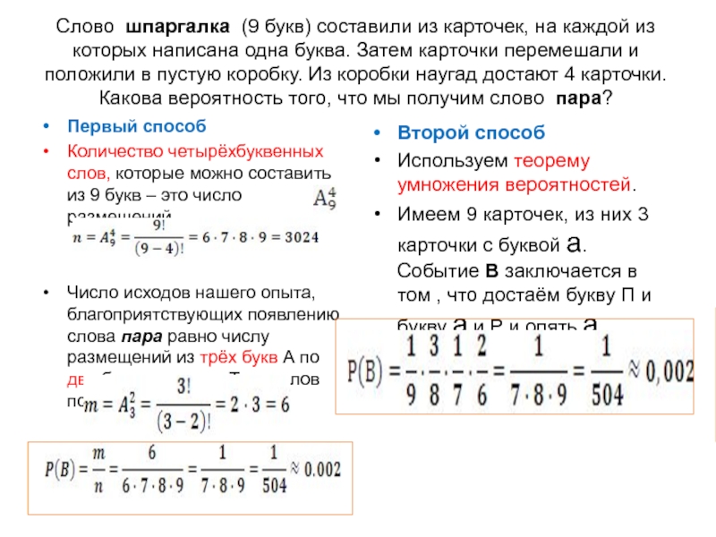 Имеем 9 карточек, из них 3 карточки с буквой а. Событие В заключается в том , что достаём букву П и букву а и Р и опять а.