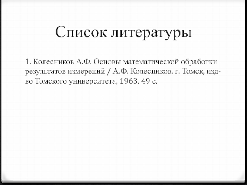 Список литературы1. Колесников А.Ф. Основы математической обработки результатов измерений / А.Ф. Колесников. г. Томск, изд-во Томского университета,