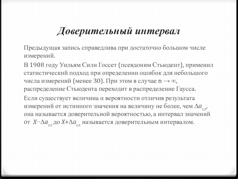 Доверительный интервалПредыдущая запись справедлива при достаточно большом числе измерений. В 1908 году Уильям Сили Госсет (псевдоним Стьюдент),