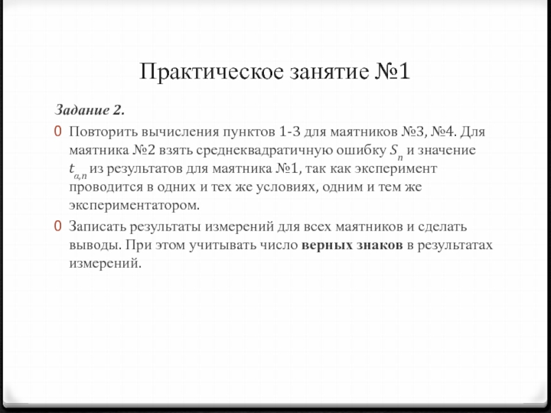 Практическое занятие №1Задание 2. Повторить вычисления пунктов 1-3 для маятников №3, №4. Для маятника №2 взять среднеквадратичную