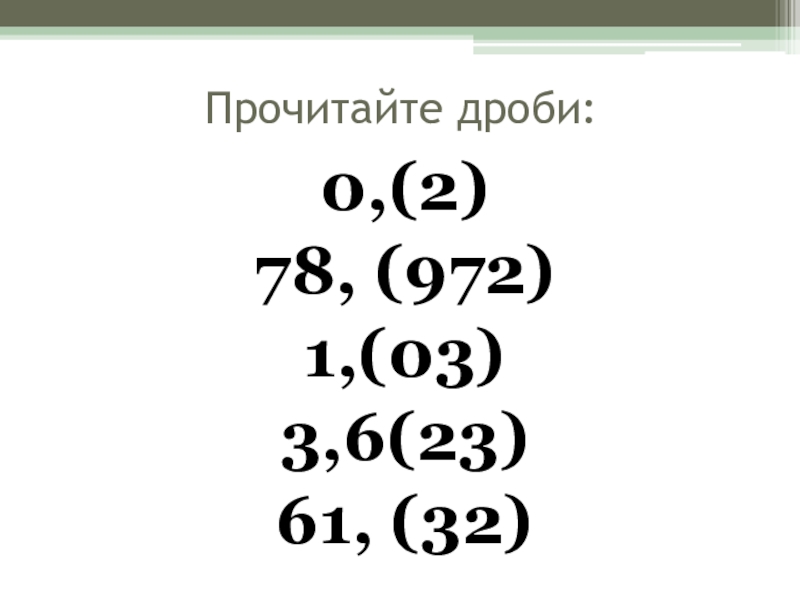 Прочитайте дроби:0,(2)78, (972) 1,(03)3,6(23)61, (32)