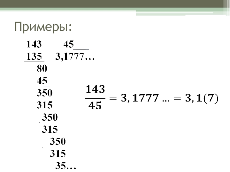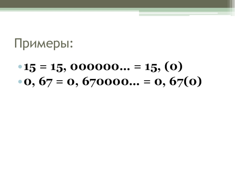 Примеры:15 = 15, 000000… = 15, (0)0, 67 = 0, 670000… = 0, 67(0)
