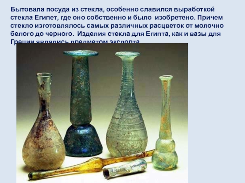 Слайд 73Бытовала посуда из стекла, особенно славился выработкой стекла Египет, где
