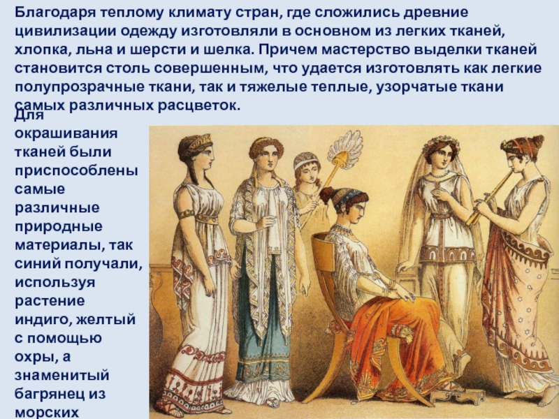 Слайд 84Благодаря теплому климату стран, где сложились древние цивилизации одежду изготовляли