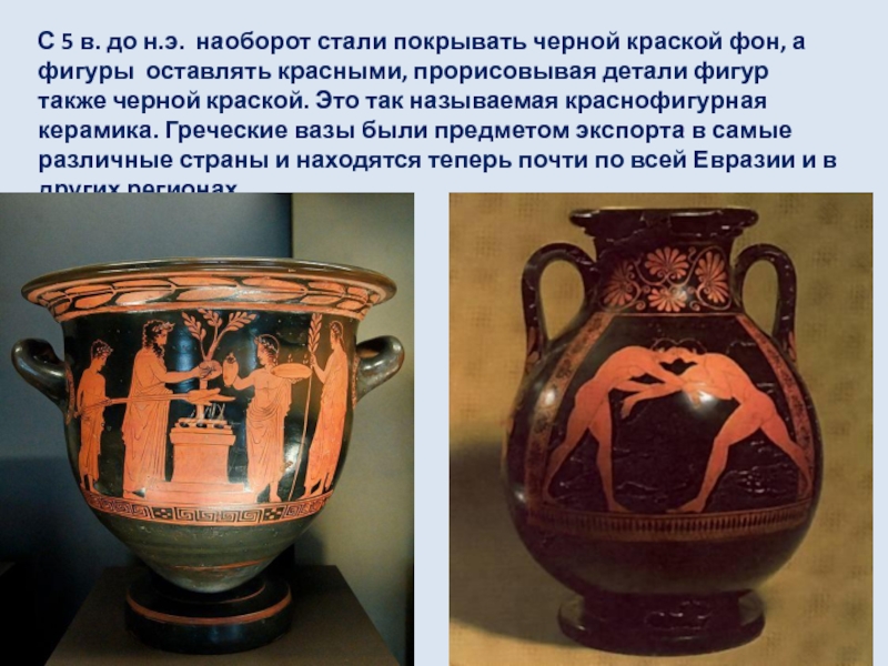 краской. Это так называемая краснофигурная керамика. Греческие вазы были предметом экспорта в самые различные страны и находятся теперь почти по всей Евразии и в других регионах.