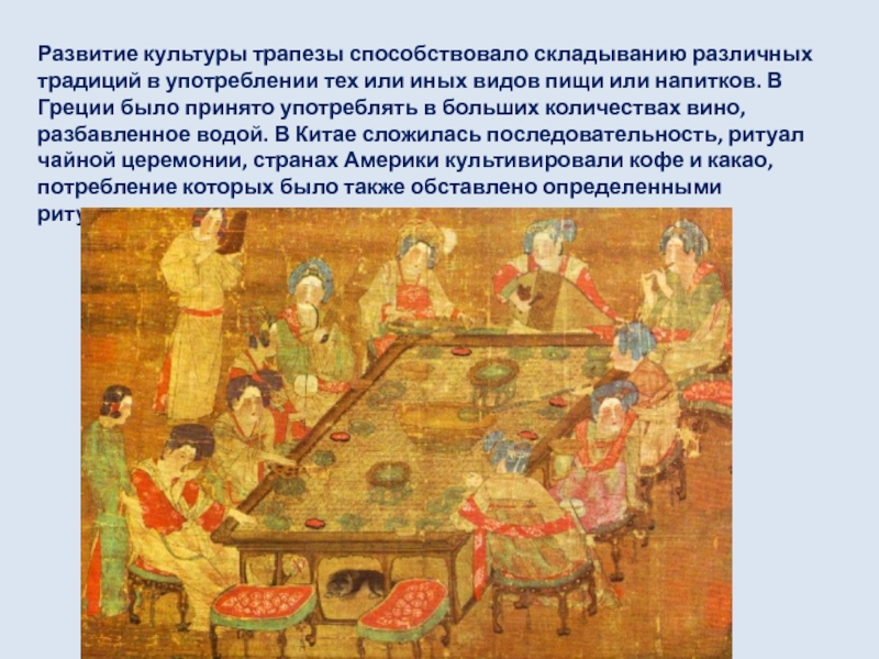 Слайд 67Развитие культуры трапезы способствовало складыванию различных традиций в употреблении тех