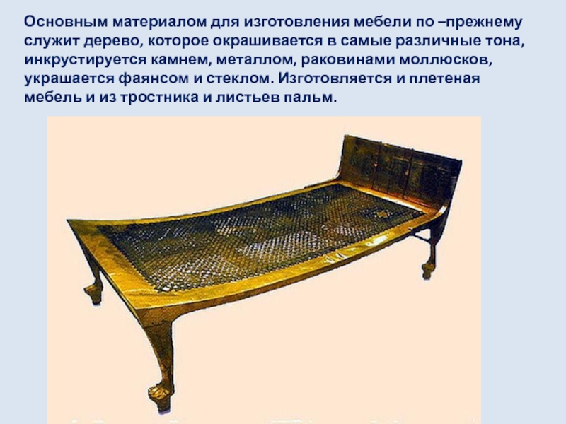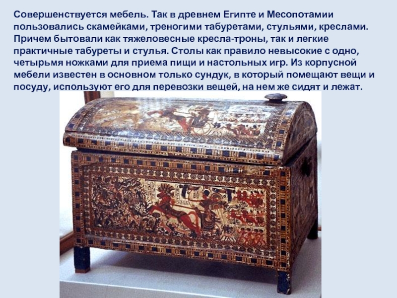 Слайд 75Совершенствуется мебель. Так в древнем Египте и Месопотамии пользовались скамейками,