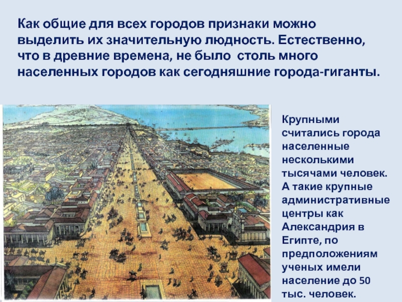 Крупными считались города населенные несколькими тысячами человек. А такие крупные административные центры как Александрия в Египте, по предположениям ученых имели население до 50 тыс. человек.