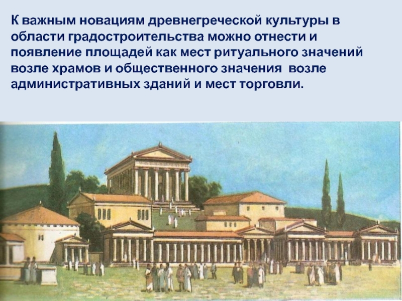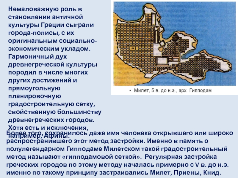 числе многих других достижений и прямоугольную планировочную градостроительную сетку, свойственную большинству древнегреческих городов. Хотя есть и исключения, например, Афины.