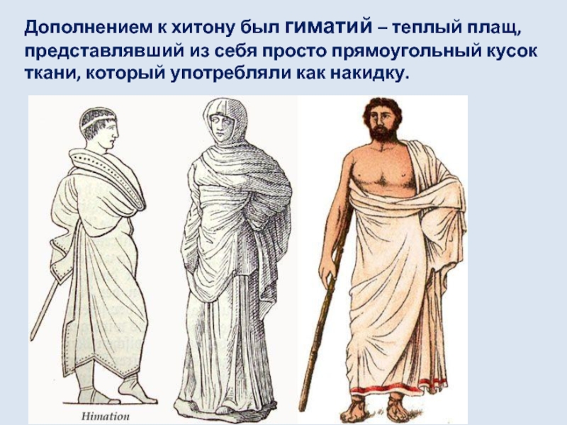 Слайд 87Дополнением к хитону был гиматий – теплый плащ, представлявший из