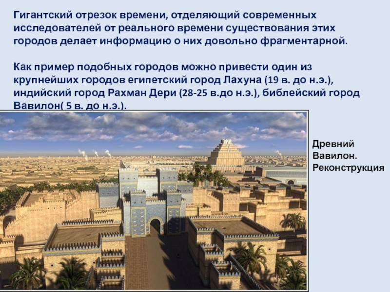 подобных городов можно привести один из крупнейших городов египетский город Лахуна (19 в. до н.э.), индийский город Рахман Дери (28-25 в.до н.э.), библейский город Вавилон( 5 в. до н.э.).
