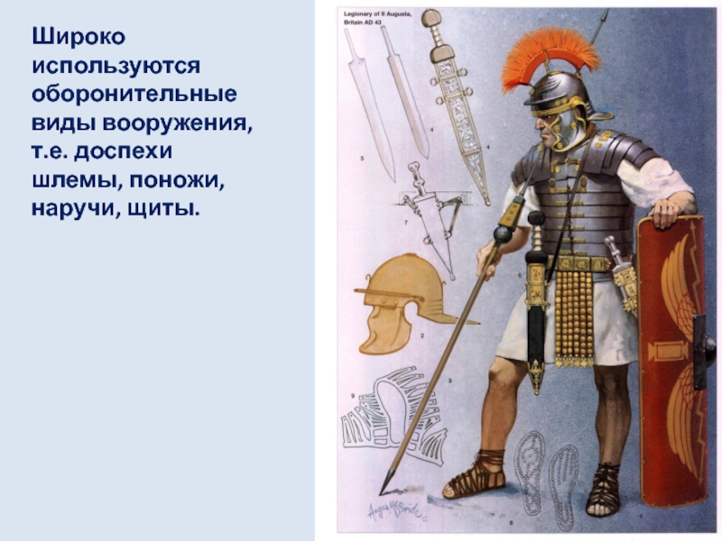 Слайд 80Широко используются оборонительные виды вооружения, т.е. доспехи шлемы, поножи, наручи,