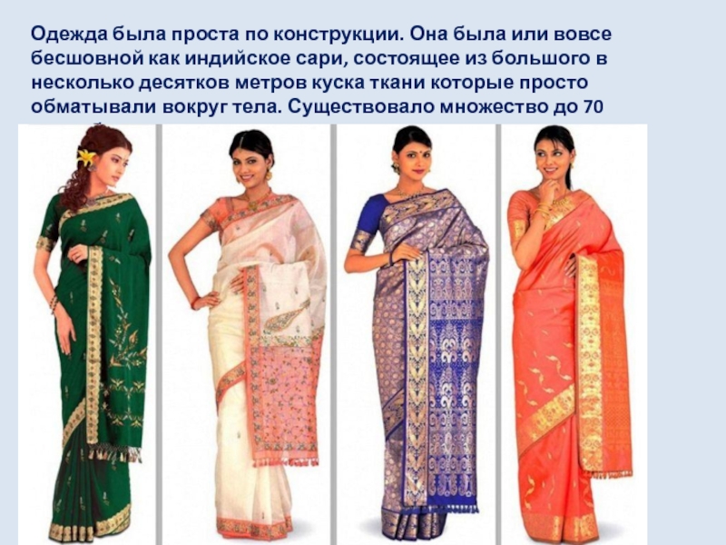 куска ткани которые просто обматывали вокруг тела. Существовало множество до 70 способов носить сари.