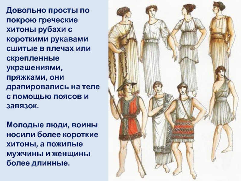 Молодые люди, воины носили более короткие хитоны, а пожилые мужчины и женщины более длинные.