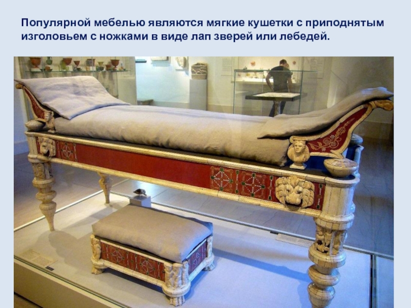 Слайд 77Популярной мебелью являются мягкие кушетки с приподнятым изголовьем с ножками