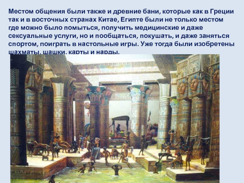 ванны с горячей или теплой водой, раздевалки, парилки.