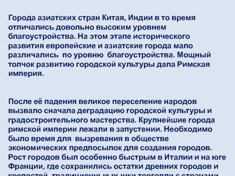 После её падения великое переселение народов вызвало сначала деградацию городской культуры и градостроительного мастерства. Крупнейшие города римской империи лежали в запустении. Необходимо было время для вызревания в обществе экономических предпосылок для создания городов. Рост городов был особенно быстрым в Италии и на юге Франции, где сохранились остатки древних городов и крепостей, традиционные рынки торговли с странами Востока.
