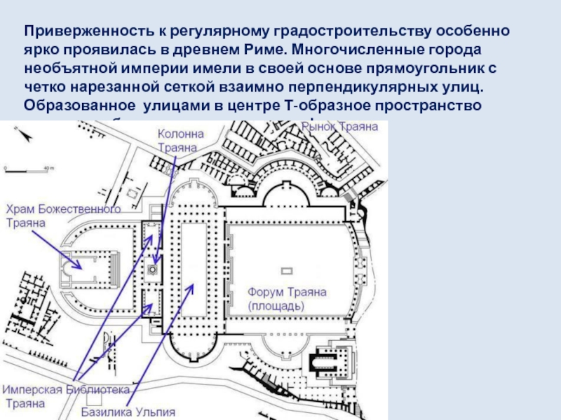 четко нарезанной сеткой взаимно перпендикулярных улиц. Образованное улицами в центре Т-образное пространство являлось общественным центром – форумом.