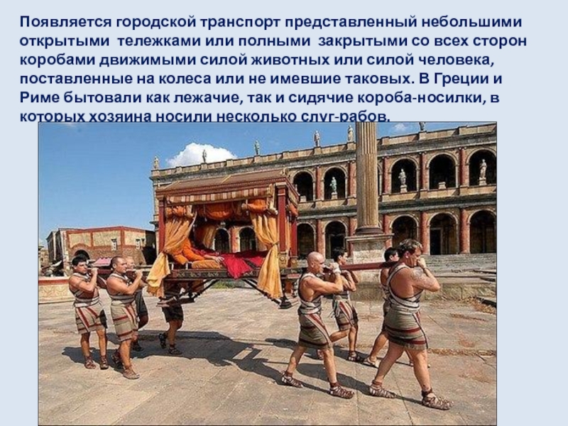 Слайд 64Появляется городской транспорт представленный небольшими открытыми тележками или полными закрытыми