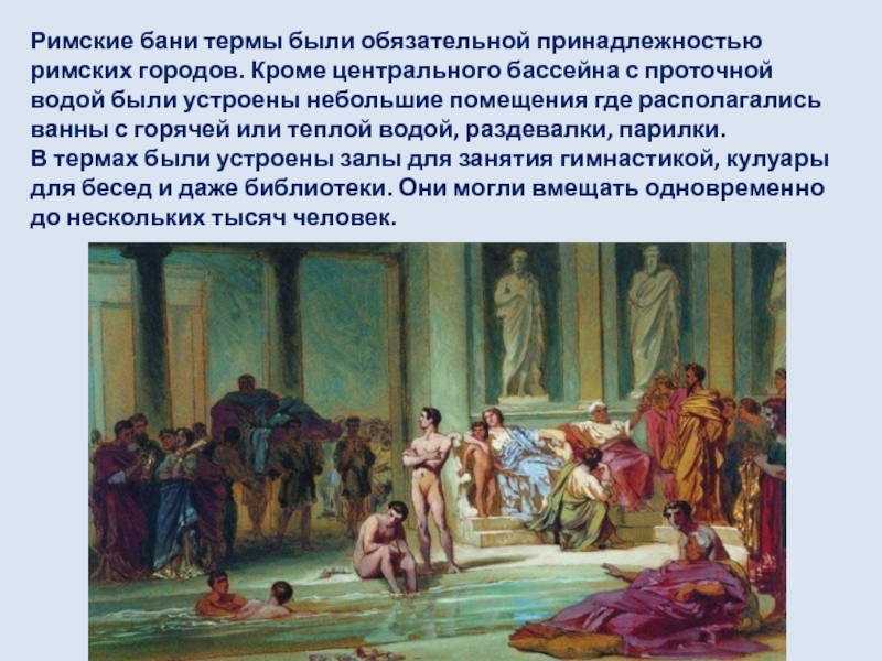 В термах были устроены залы для занятия гимнастикой, кулуары для бесед и даже библиотеки. Они могли вмещать одновременно до нескольких тысяч человек.