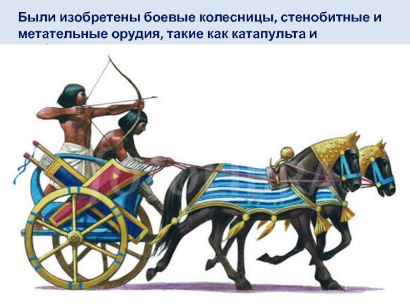Слайд 82Были изобретены боевые колесницы, стенобитные и метательные орудия, такие как