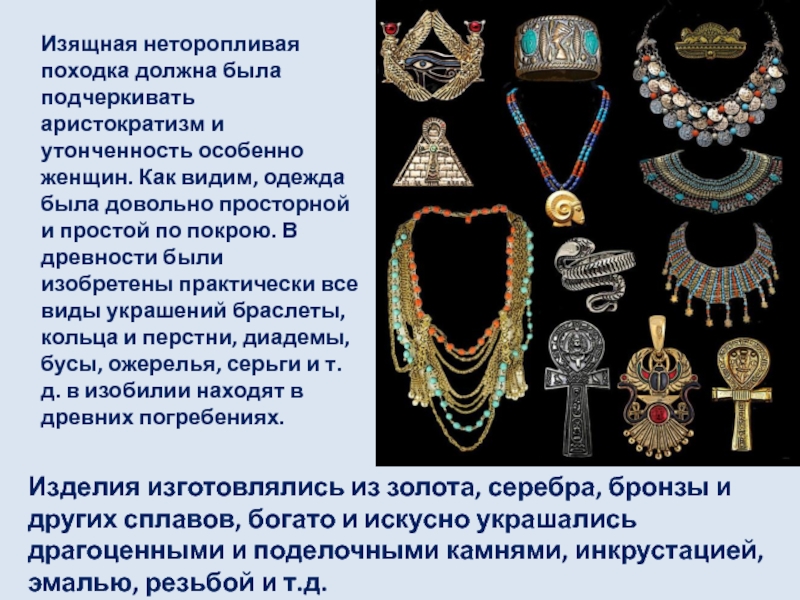 покрою. В древности были изобретены практически все виды украшений браслеты, кольца и перстни, диадемы, бусы, ожерелья, серьги и т.д. в изобилии находят в древних погребениях.