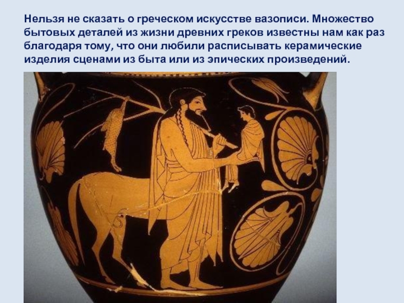 Слайд 70Нельзя не сказать о греческом искусстве вазописи. Множество бытовых деталей
