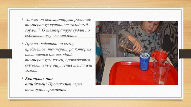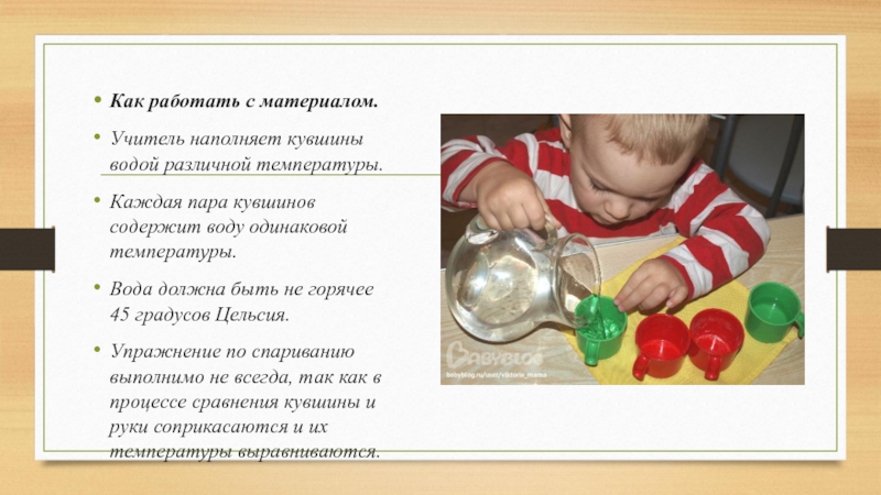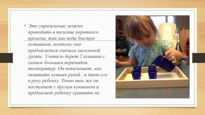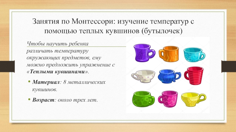 Слайд 3Занятия по Монтессори: изучение температур с помощью теплых кувшинов (бутылочек)