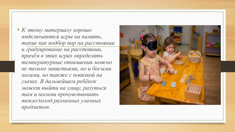 в этих играх определять температурные отношения можно не только запястьями, но и босыми ногами, но также с повязкой на глазах. В дальнейшем ребёнок может выйти на улицу, разуться там и ногами прочувствовать тепло/холод различных уличных предметов.